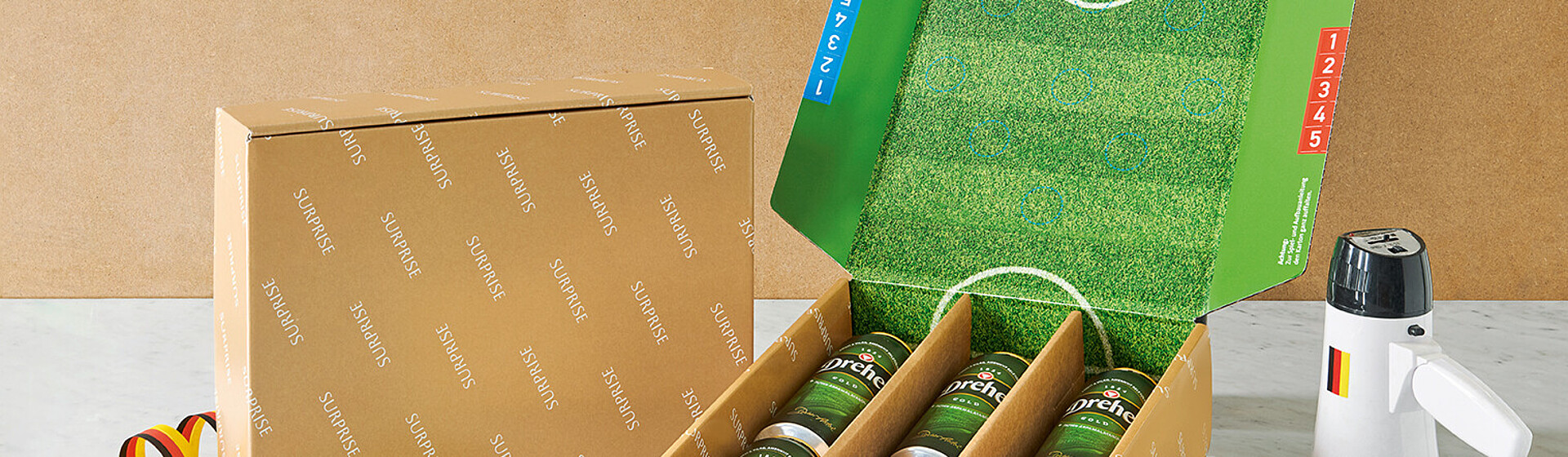 Unsere Surprise-Geschenkverpackung lässt das Herz von Fußballfans höher schlagen: Ein spannendes Geschicklichkeitsspiel im Mini-Fußballstadion sorgt sofort für Spannung & Spielspaß. Das Motiv Surprise Fußball ist als 3er Präsentkarton, 360 mm, erhältlich.