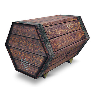 Bag in Box 3 Liter in einem besonderen Fass-Design, Matt-/Glanzeffekte, im Bodenintegrierte Standfüße