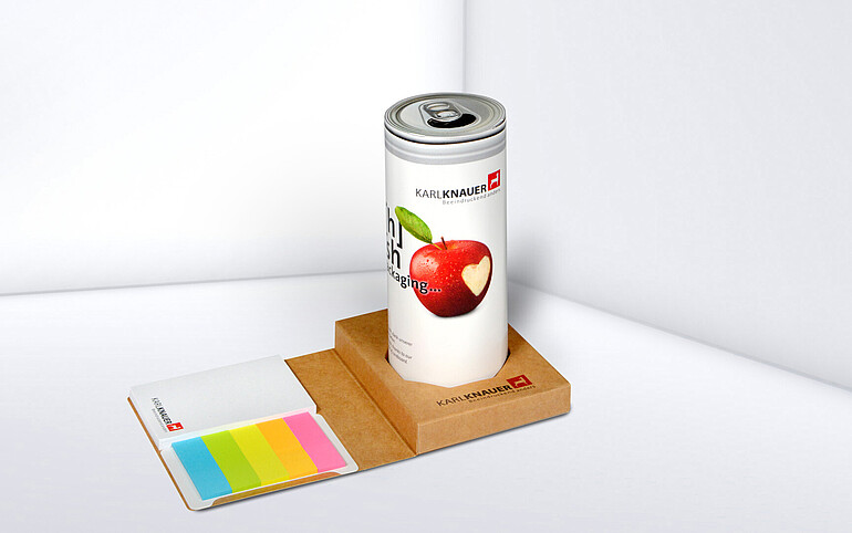 Die täuschend echte Optik macht das hochwertige Büro-Utensil zu einem originellen Hingucker – gefertigt aus nachhaltigem Kartonmaterial. Unter dem Deckel der „Dose“ verbirgt sich ein praktischer Stifteköcher, in dem Kugelschreiber, Scheren und Co. bequem Platz finden. Zusätzlichen Mehrwert bietet das im Set enthaltene Zubehör: ein Ständer für die Dose, der zugleich aus farbenfrohen Markern – wahlweise aus individuell gestaltbarem Papier oder klassischen Markerset in Neonfarben – sowie einem Block mit praktischen Haftnotizen besteht. Wie alle Werbemittel von Karl Knauer lässt sich auch dieser smarte Organizer individuell gestalten. Ob mit einem kreativen Kampagnen-Motiv, einer Grußbotschaft zu einem besonderen Anlass oder im Corporate Design des Unternehmens – bereits ab einer Auflage von 500 Stück ist nahezu alles möglich.