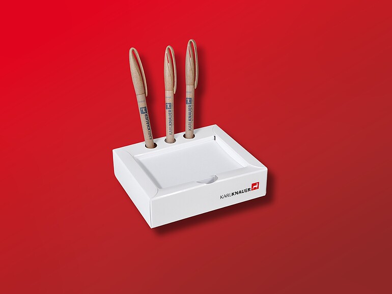 Die kleine Zettelbox mit Stiftehalter, die der Werbemittelspezialist Karl Knauer aus dem Schwarzwald neu im Programm hat, ist „schlicht und einfach gut“ – und damit das perfekte Give-away für Minimalisten. Ihr auf das Wesentliche reduziertes Design fügt sich unauffällig in jede Umgebung ein: im Büro, auf dem Telefontischchen zu Hause oder am Empfang in der Praxis. Die schlanke Kartonbox bietet Platz für rund 230 Blatt und drei Stifte und, wenn man möchte, selbstverständlich auch für einen dezenten Werbeaufdruck.