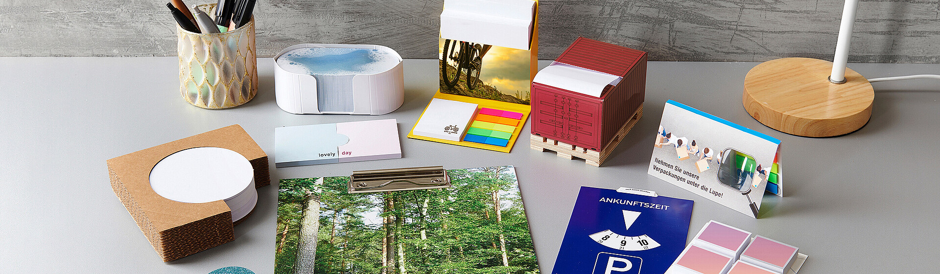 Unsere beliebten Haftprodukte bieten wir auch als konstruktive Sonderanfertigungen. Sei es bei Material, Veredelungen, Formen, Größen und Blattzahlen – nahezu alles ist umsetzbar. Besonders wirkungsvoll sind z. B. Produktnachbildungen oder Effektumschläge. Zudem lassen sich verschiedene Haftprodukte wie Haftnotizen, Haftmarker mit z. B. einem Schreibblock kombinieren